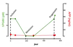 Colorectal cancer is not the only type of cancer to express hPG80. Its expression has also been demonstrated in ovarian cancers, liver tumors and pancreatic tumors.[4][40][41] Thus, several types of tumors express the unmatured peptide. hPG80 can be detected and quantified in the blood of cancer patients. A first demonstration has been made in colorectal cancer showing an increase of hPG80 and non-amide gastrin levels in plasma in these patients compared to a control series (healthy individuals).[8] In addition, an hPG80 increase has been observed in patients with adenomatous polyps.[15] hPG80 is therefore expressed at all stages by the tumor, from early stages to metastasis.