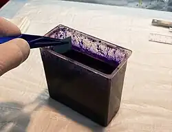Haematoxylin has been synthesized,[19][20] although never in commercially viable amounts.[14][21] Historically the logwood was exported and the haematoxylin extracted in Europe. More recently extraction takes place closer to where the logwood is harvested.[18] Extraction of haematoxylin from logwood on industrial scales has been accomplished in the 'French process' by boiling the wood chips or in the 'American process' with steam and pressure.[9][22] Once extracted, the dye can be sold as a liquid concentrate or dried and sold in a crystalline form.[9] Modern production methods use water, ether or alcohol as a solvent, at which point the extracts may be further refined to the level of purity needed.[18]