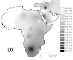 L0 is found most commonly in Sub-Saharan Africa. It reaches its highest frequency in the Khoisan people at 73% on average.[6] Some of the highest frequencies are:[7] Namibia (!Xun) 79%, South Africa (Khwe/!Xun) 83%, and Botswana (!Kung) 100%.