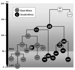 - ↑ Age estimates (ka, 95% CI in angular brackets): ML whole-mtDNA age estimate: 128.2 [95% CI: 107.9-148.9], ρ whole-mtDNA age estimate: 121.3 [99.2;143.7], ρ synonymous age estimate (ka): 131.0 [97.8;164.2]: Rito T, Richards MB, Fernandes V, Alshamali F, Cerny V, Pereira L, Soares P., "The first modern human dispersals across Africa", PLoS One 2013 Nov 13; 8(11):e80031. doi: 10.1371/journal.pone.0080031.