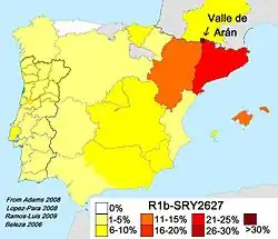 In 2008 a study by Adams and colleagues covered the whole of the Iberian Peninsula. It found the highest levels of this haplogroup in Catalonia.[6] In the same year a study by López-Parra and colleagues concentrated on the populations of the Spanish Pyrenees. They discovered a high levels of this haplogroup in the central and eastern Pyrenees. The highest level so far discovered (48%) was found in the Val d'Aran, Catalonia.[7]