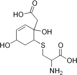Normally, the breakdown of the amino acid tyrosine involves the conversion of 4-hydroxyphenylpyruvate to homogentisate by 4-hydroxyphenylpyruvate dioxygenase. Complete deficiency of this enzyme would lead to tyrosinemia III. In rare cases, however, the enzyme is still able to produce the reactive intermediate 1,2-epoxyphenyl acetic acid, but is unable to convert this intermediate to homogentisate. The intermediate then spontaneously reacts with glutathione to form 2-L-cystein-S-yl-1,4-dihydroxy-cyclohex-5-en-1-yl acetic acid (hawkinsin).[3][4]