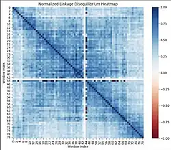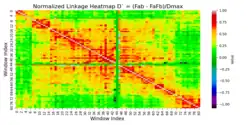 This heatmap visualizes normalized linkage disequilibrium (D′) between genomic windows, showing how often alleles are inherited together. Using JavaFX Canvas APIGraphicsContext.fillRect()andColorclasses enable full control over rendering.[36] - JFreeChart supports heat map-style visualizations using