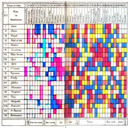 Heat maps originated in 2D displays of the values in a data matrix. Larger values were represented by small dark gray or black squares (pixels) and smaller values by lighter squares. The earliest known example dates to 1873, when Toussaint Loua used a hand-drawn and colored shaded matrix to visualize social statistics across the districts of Paris.[1] The idea of reordering rows and columns to reveal structure in a data matrix, known as seriation, was introduced by Flinders Petrie in 1899. In 1950, Louis Guttman developed the Scalogram, a method for ordering binary matrices to expose a one-dimensional scale structure. In 1957, Peter Sneath displayed the results of a cluster analysis by permuting the rows and the columns of a matrix to place similar values near each other according to the clustering. This idea was implemented by Robert Ling in 1973 with a computer program called SHADE. Ling used overstruck printer characters to represent different shades of gray, one character-width per pixel.[1] Leland Wilkinson developed the first computer program in 1994 (SYSTAT) to produce cluster heat maps with high-resolution color graphics. The Eisen et al. display shown in the figure is a replication of the earlier SYSTAT design.[1]