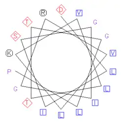 - ↑ Schiffer M, Edmundson AB (1967). "Use of helical wheels to represent the structures of proteins and to identify segments with helical potential". Biophysical Journal. 7 (2): 121–35. Bibcode:1967BpJ.....7..121S. doi:10.1016/S0006-3495(67)86579-2. PMC 1368002. PMID 6048867.