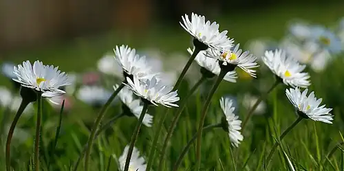 Heliotropic flowers track the Sun's motion across the sky from east to west. Daisies or Bellis perennis close their petals at night but open in the morning light and then follow the sun as the day progresses. During the night, the flowers may assume a random orientation, while at dawn they turn again toward the east where the Sun rises. The motion is performed by motor cells in a flexible segment just below the flower, called a pulvinus. The motor cells are specialized in pumping potassium ions into nearby tissues, changing their turgor pressure. The segment flexes because the motor cells at the shadow side elongate due to a turgor rise. This is considered to be turgor-mediated heliotropism. For plant organs that lack pulvini, heliotropism can occur through irreversible cell expansion producing particular growth patterns. This form of heliotropism is considered to be growth-mediated.[5] Heliotropism is a response to light from the Sun.
