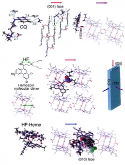The best-understood examples of such hematin biocrystallization inhibitors are quinoline drugs such as chloroquine and mefloquine. These drugs bind to both free heme and hemozoin crystals,[39] and therefore block the addition of new heme units onto the growing crystals. The small, most rapidly growing face is the face to which inhibitors are believed to bind.[40][41]