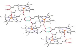β-Hematin crystals are made of dimers of hematin molecules that are, in turn, joined together by hydrogen bonds to form larger structures. In these dimers, an iron-oxygen coordinate bond links the central iron of one hematin to the oxygen of the carboxylate side-chain of the adjacent hematin. These reciprocal iron–oxygen bonds are highly unusual and have not been observed in any other porphyrin dimer. β-Hematin can be either a cyclic dimer or a linear polymer,[31] a polymeric form has never been found in hemozoin, disproving the widely held idea that hemozoin is produced by the enzyme heme-polymerase.[32]