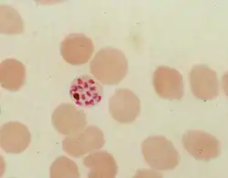 During its intraerythrocytic asexual reproduction cycle Plasmodium falciparum consumes up to 80% of the host cell hemoglobin.[8][9] The digestion of hemoglobin releases monomeric α-hematin (ferriprotoporphyrin IX). This compound is toxic, since it is a pro-oxidant and catalyzes the production of reactive oxygen species. Oxidative stress is believed to be generated during the conversion of heme (ferroprotoporphyrin) to hematin (ferriprotoporphyrin). Free hematin can also bind to and disrupt cell membranes, damaging cell structures and causing the lysis of the host erythrocyte.[10] The unique reactivity of this molecule has been demonstrated in several in vitro and in vivo experimental conditions.[11]