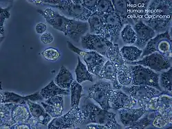 Hep G2 is an immortal cell line which was derived in 1975 from the liver tissue of a 15-year-old Caucasian male from Argentina with a well-differentiated hepatocellular carcinoma.[1] These cells are epithelial in morphology, have a modal chromosome number of 55, and are not tumorigenic in nude mice.[2] The cells secrete a variety of major plasma proteins, e.g., albumin, and the acute-phase proteins fibrinogen, alpha 2-macroglobulin, alpha 1-antitrypsin, transferrin and plasminogen. They have been grown successfully in large-scale cultivation systems. Hepatitis B virus surface antigens have not been detected. Hep G2 will respond to stimulation with human growth hormone.