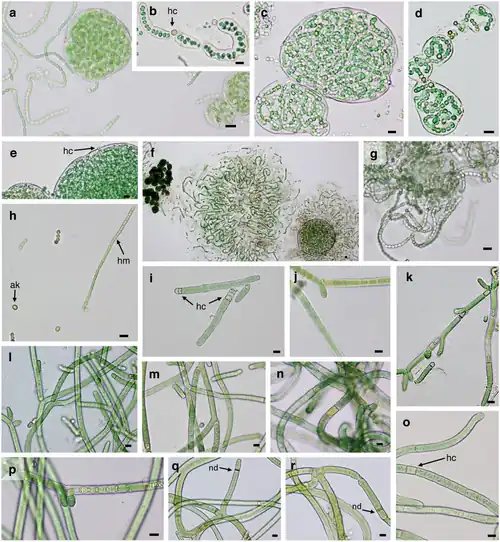 Scale bar = 10 μm. Abbreviations: hc - heterocyst, ak - akinete, hm - hormogonium, nd - necridia