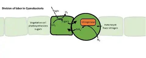 Some cells within clonal filaments differentiate into heterocysts (large, round cell, right). Heterocysts abandon oxygen-producing photosynthesis in order to fix nitrogen with the oxygen-sensitive enzyme nitrogenase. Vegetative and heterocyst cells divide labor by exchanging sugars and nitrogen.