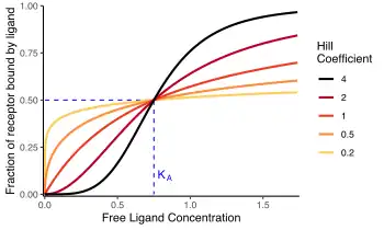 This last form of the Hill equation is advantageous because a plot of versus yields a linear plot, which is called a Hill plot.[7][8] Because the slope of a Hill plot is equal to the Hill coefficient for the biochemical interaction, the slope is denoted by . A slope greater than one thus indicates positively cooperative binding between the receptor and the ligand, while a slope less than one indicates negatively cooperative binding.