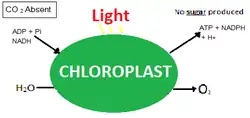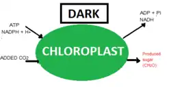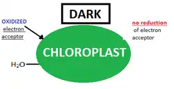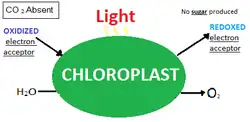 Chloroplasts placed under dark conditions and in the absence of CO2, oxidize the artificial acceptor but do not reduce it, terminating the process, without production of oxygen or sugar.[4]