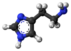 Histamine is an organic nitrogenous compound involved in local immune responses communication, as well as regulating physiological functions in the gut and acting as a neurotransmitter for the brain, spinal cord, and uterus.[3][4] Discovered in 1910, histamine has been considered a local hormone (autocoid) because it is produced without involvement of the classic endocrine glands; however, in recent years, histamine has been recognized as a central neurotransmitter.[5] Histamine is involved in the inflammatory response and has a central role as a mediator of itching.[6] As part of an immune response to foreign pathogens, histamine is produced by basophils and by mast cells found in nearby connective tissues. Histamine increases the permeability of the capillaries to white blood cells and some proteins, to allow them to engage pathogens in the infected tissues.[7] It consists of an imidazole ring attached to an ethylamine chain; under physiological conditions, the amino group of the side-chain is protonated.
