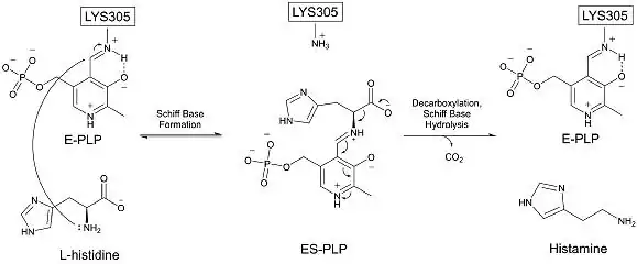 HDC decarboxylates histidine through the use of a PLP cofactor initially bound in a Schiff base to lysine 305.[11] Histidine initiates the reaction by displacing lysine 305 and forming an aldimine with PLP. Then, histidine's carboxyl group leaves the substrate, forming carbon dioxide. This is the rate-limiting step of the all process, requiring an activation energy of 17.6 kcal/mol [12] and fitting the experimental turnover of 1.73 .[13] After the decarboxylation takes place, the PLP intermediate is protonated by tyrosine 334 from the second subunit. The protonation is mediated by a water molecule and it is very fast and also very exergonic.[12] Finally, PLP re-forms its original Schiff base at lysine 305, and histamine is released. This mechanism is very similar to those employed by other pyridoxal-dependent decarboxylases. In particular, the aldimine intermediate is a common feature of all known PLP-dependent decarboxylases.[14] HDC is highly specific for its histidine substrate.[15]