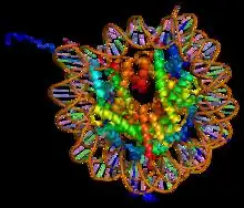 - ↑ Khorasanizadeh S (January 2004). "The nucleosome: from genomic organization to genomic regulation". Cell. 116 (2): 259–72. doi:10.1016/s0092-8674(04)00044-3. PMID 14744436. S2CID 15504162.
