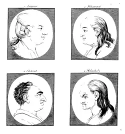 In ancient Greece, disease was thought due to an imbalance in the four basic bodily fluids, or humors. Personality types were similarly thought to be determined by the dominant humor in a particular person. Derived from the Ancient Greek melas, "black", and kholé, "bile",[1] melancholia was described as a distinct disease with particular mental and physical symptoms by Hippocrates in his Aphorisms, where he characterized all "fears and despondencies, if they last a long time" as being symptomatic of the ailment.[2]