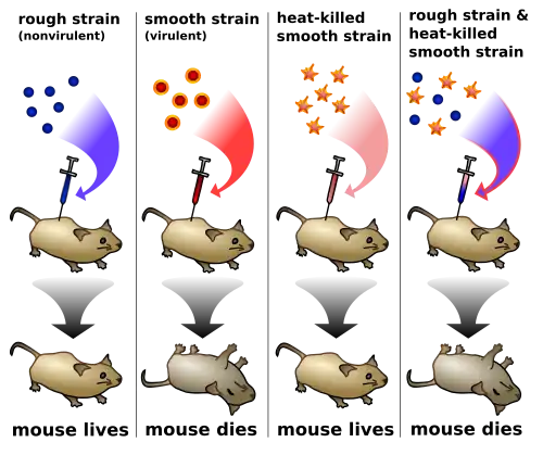 Various genetic discoveries have been essential in the development of genetic engineering. Genetic inheritance was first discovered by Gregor Mendel in 1865 following experiments crossing peas. Although largely ignored for 34 years he provided the first evidence of hereditary segregation and independent assortment.[16] In 1889 Hugo de Vries came up with the name "(pan)gene" after postulating that particles are responsible for inheritance of characteristics[17] and the term "genetics" was coined by William Bateson in 1905.[18] In 1928 Frederick Griffith proved the existence of a "transforming principle" involved in inheritance, which Avery, MacLeod and McCarty later (1944) identified as DNA. Edward Lawrie Tatum and George Wells Beadle developed the central dogma that genes code for proteins in 1941. The double helix structure of DNA was identified by James Watson and Francis Crick in 1953.