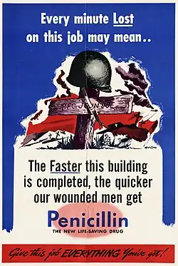 Ethel and Howard Florey published the results of clinical trials of penicillin in The Lancet on 27 March 1943, reporting the treatment of 187 cases of sepsis with penicillin.[98] It was upon this medical evidence that the British War Cabinet set up the Penicillin Committee on 5 April 1943. The committee consisted of Cecil Weir, Director General of Equipment, as chairman; Alexander Fleming; Howard Florey; V. D. Allison, another one of Fleming's former research students; Sir Percival Hartley, the head of the MRC; and representatives from pharmaceutical companies.[99] This led to the mass production of penicillin by the next year.[100]
