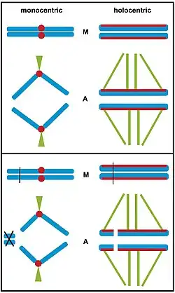 Holocentric chromosomes are chromosomes that possess multiple kinetochores along their length rather than the single centromere typical of other chromosomes.[1] They were first described in cytogenetic experiments in 1935. Since this first observation, the term holocentric chromosome has referred to chromosomes that: i) lack the primary constriction corresponding to the centromere observed in monocentric chromosomes;[2] and ii) possess multiple kinetochores dispersed along the entire chromosomal axis, such that microtubules bind to the chromosome along its entire length and move broadside to the pole from the metaphase plate.[3] Holocentric chromosomes are also termed holokinetic, because, during cell division, the sister chromatids move apart in parallel and do not form the classical V-shaped figures typical of monocentric chromosomes.[4][5][6]