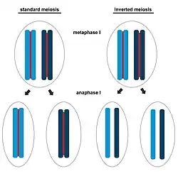 However, the understanding of the reductional division in meiosis of Ascaris spp. has been obtained by studying the holocentric chromosomes which, in many other taxa, follow a reverse order of meiotic division.[12] Indeed, as reported in several nematodes, in insects belonging to the Hemiptera and Lepidoptera,[55][56] in mites,[57] and in some flowering plants,[8] species with holocentric chromosomes generally present an inverted meiotic sequence, in which segregation of homologs is postponed until the second meiotic division.