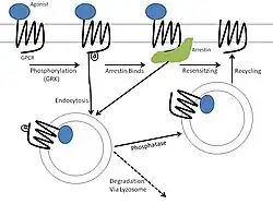In contrast to receptor uncoupling, endocytosis can occur through multiple pathways. GPCR endocytosis has been shown to be either dependent or independent of arrestin activity, depending on the cell type used in the experiment; however, the former is more common. Furthermore, the same receptor expressed in two distinct cell types can be endocytosed through different mechanisms due to differences in GRK and arrestin expression: either through clathrin-coated vesicles or caveolae.[4] In general, receptor sequestration preferentially affects receptors that are both activated and phosphorylated, but the phosphorylation is not always a necessary component of endocytosis. After being sequestered, the affected receptors can either be degraded by lysosomes or reinserted into the plasma membrane, which is called receptor recycling.[5]