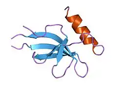 This protein domain is thought to have a SH3-like barrel structure. Additionally, the structure of a hypothetical protein in this family has been solved and it forms a beta sheet structure with a terminating alpha helix. HspQ forms a stable homodimer in solution and can form homomultimers consisting of about four monomers. The theoretical molecular mass of the HspQ protein were calculated to be 11.8 kDa. It is putatively thought that HspQ requires a cofactor to form a functional hetero-oligomeric complex.[2]