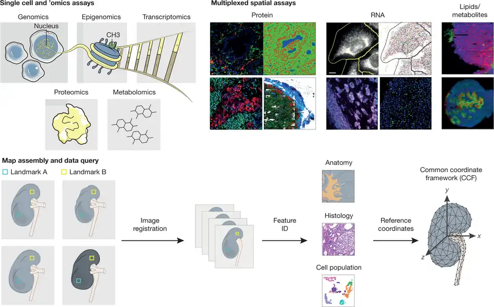 - 1 2 3 Snyder MP, Lin S, Posgai A, Atkinson M, Regev A, Rood J, et al. (HuBMAP Consortium) (October 2019). "The human body at cellular resolution: the NIH Human Biomolecular Atlas Program". Nature. 574 (7777): 187–192. Bibcode:2019Natur.574..187H. doi:10.1038/S41586-019-1629-X. PMC 6800388. PMID 31597973.