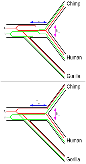 - ↑ Takahata, N.; Satta, Y.; Klein, J. (1995). "Divergence time and population size in the lineage leading to modern humans". Theor Popul Biol. 48 (2): 198–221. Bibcode:1995TPBio..48..198T. doi:10.1006/tpbi.1995.1026. PMID 7482371.