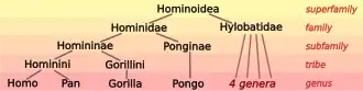 Biologists classify humans, along with only a few other species, as great apes (species in the family Hominidae). The living Hominidae include two distinct species of chimpanzee (the bonobo, Pan paniscus, and the chimpanzee, Pan troglodytes), two species of gorilla (the western gorilla, Gorilla gorilla, and the eastern gorilla, Gorilla graueri), and two species of orangutan (the Bornean orangutan, Pongo pygmaeus, and the Sumatran orangutan, Pongo abelii). The great apes with the family Hylobatidae of gibbons form the superfamily Hominoidea of apes.