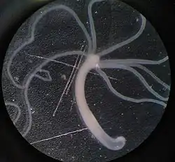 Hydramacin-1 was first isolated from epithelial cells of the cnidarian Hydra, a small (almost-microscopic) freshwater animal related to corals, sea anemones and jellyfish.[2][3][4][5] Like other members of the Phylum Cnidaria, Hydra possesses specialized defensive epithelial cells called cnidocytes that shoot toxic barbs into organisms they come in physical contact with. German researchers managed to isolate the gene that coded for the production of the protein from the Hydra genome in 2008. The gene was transferred and cloned in a plasmid (Pet32a) which was inserted in the bacteria Escherichia coli, a standard method of replicating a protein isolated from a much larger organism.[1] The three-dimensional structure of the resulting protein was then determined by NMR spectroscopy and is now published online by the Protein Data Bank.[6]