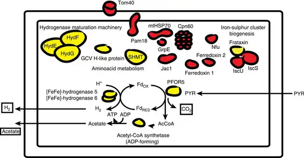 - ↑ Schneider RE, Brown MT, Shiflett AM, Dyall SD, Hayes RD, Xie Y, et al. (November 2011). "The Trichomonas vaginalis hydrogenosome proteome is highly reduced relative to mitochondria, yet complex compared with mitosomes". International Journal for Parasitology. 41 (13–14): 1421–34. doi:10.1016/j.ijpara.2011.10.001. PMC 4437511. PMID 22079833.