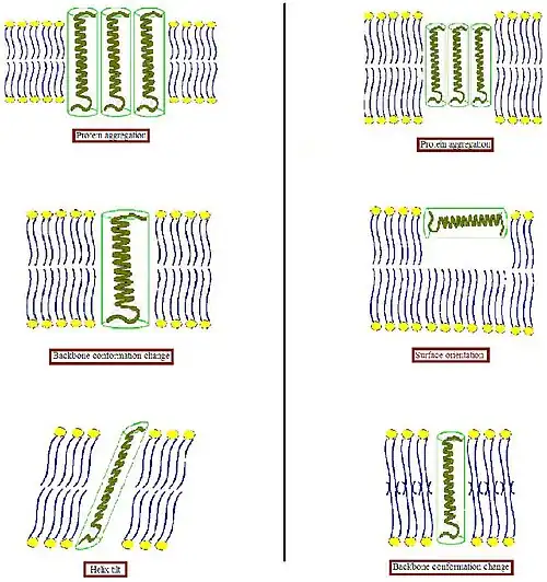In a molecular theory of the lipid chains of the membrane, peptides, with their hydrophobic length, were treated as providing a boundary condition on the configuration of the lipid chains.[21] A molecular modeling was combined with phenomenological free energy contributions describing lipid head group repulsion and membrane solvent surface tension. Duque et al.[22]