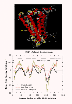 The Stephen H. White website[34] provides an example of whole residue hydrophobicity scales showing the free energy of transfer ΔG(kcal/mol) from water to POPC interface and to n-octanol.[34] These two scales are then used together to make Whole residue hydropathy plots.[34] The hydropathy plot constructed using ΔGwoct − ΔGwif shows favorable peaks on the absolute scale that correspond to the known TM helices. Thus, the whole residue hydropathy plots illustrate why transmembrane segments prefer a transmembrane location rather than a surface one.[35][36][37][38]