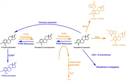 4-OH-E2 shares the metabolic scheme of 2-OH-E2: methylation to 4-methoxyestradiol (4-meOE2), oxidation to quinones, or dehydrogenation to 4-OH-E1. Conjugation by the ubiquitously present COMT represents the most common extrahepatic pathway of 4-OH-E2 inactivation. However, if estrogen homeostasis is imbalanced by an increase in CYP1B1 and a decrease in COMT, a greater degree of genotoxic quinone formation from 4-OH-E2 will occur.[9] 4-OHE2 can be oxidized by microsomal CYPs or peroxidases to yield estradiol-3,4-semiquinone.[10] This semiquinone can undergo redox cycling with oxygen to form estradiol-3,4-quinone (E2-3,4-Q) and superoxide. E2-3,4-Q can be converted back to 4-OHE2 in a single step by quinone reductase, or in two sequential steps catalysed by P450 reductase via the semiquinone intermediate. GSH / S-transferase activity can abrogate E2-3,4-Q levels via formation of glutathione conjugates.