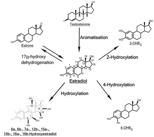 The hydroxylation of estradiol is one of the major routes of metabolism of the estrogen steroid hormone estradiol. It is hydroxylated into the catechol estrogens 2-hydroxyestradiol and 4-hydroxyestradiol and into estriol (16α-hydroxyestradiol), reactions which are catalyzed by cytochrome P450 enzymes predominantly in the liver, but also in various other tissues.