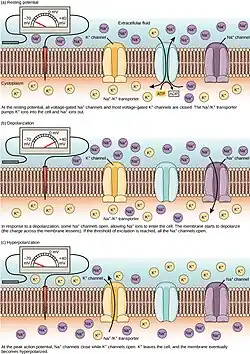 Voltage gated ion channels respond to changes in the membrane potential. Voltage gated potassium, chloride and sodium channels are key components in the generation of the action potential as well as hyper-polarization. These channels work by selecting an ion based on electrostatic attraction or repulsion allowing the ion to bind to the channel.[2] This releases the water molecule attached to the channel and the ion is passed through the pore. Voltage gated sodium channels open in response to a stimulus and close again. This means the channel either is open or not, there is no part way open. Sometimes the channel closes but is able to be reopened right away, known as channel gating, or it can be closed without being able to be reopened right away, known as channel inactivation.
