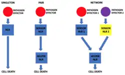 In the cooperation mechanisms, when the sensor NLR recognizes the effector protein it signals to the helper NLR, thus activating it.[21]