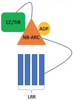 Very often, the resistance mediated by R genes is due to them inducing HR, which leads to apoptosis. Most plant R genes encode NOD-like receptor (NLR) proteins.[6] NLR protein domain architecture consists of an NB-ARC domain which is a nucleotide-binding domain, responsible for conformational changes associated with the activation of the NLR protein. In the inactive form, the NB-ARC domain is bound to Adenosine diphosphate (ADP). When a pathogen is sensed, the ADP is exchanged for Adenosine triphosphate (ATP) and this induces a conformational change in the NLR protein, which results in HR. At the N-terminus, the NLR either has a Toll-Interleukin receptor (TIR) domain (also found in mammalian toll-like receptors) or a coiled-coil (CC) motif. Both TIR and CC domains are implicated in causing cell death during HR. The C-terminus of the NLRs consists of a leucine-rich repeat (LRR) motif, which is involved in sensing the pathogen virulence factors.[7]