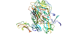 ICAM-1 (Intercellular Adhesion Molecule 1) also known as CD54 (Cluster of Differentiation 54) is a protein that in humans is encoded by the ICAM1 gene.[5][6] This gene encodes a cell surface glycoprotein which is typically expressed on endothelial cells and cells of the immune system. It binds to integrins of type CD11a / CD18, or CD11b / CD18 and is also exploited by rhinovirus as a receptor for entry into respiratory epithelium.[7]