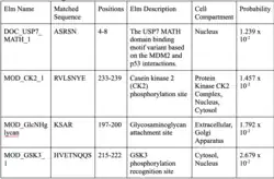 Eukaryotic Linear Motif (ELM) was used to find protein Motifs. The list ELM provided was after globular domain filtering, structural filtering, and context filtering. The four Motifs shown are organized by probability and are conserved in mammalian orthologs.[14]