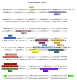 The promotor region and transcription factors are shown in the promotor diagram. The transcription factors shown were highly conserved in animal orthologs of IGSF6.