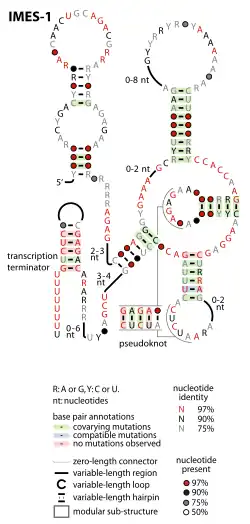 The IMES-1 RNA motif is a conserved RNA structure that was identified in marine environmental sequences by two studies based on metagenomics and bioinformatics, the first analyzing metatranscriptome (RNA) data[2] and the second using metagenome (DNA) data.[1] These RNAs are present in environmental sequences, and as of 2009 are not known to be present in any cultivated species. However, the species that use these RNAs are most closely related to known alphaproteobacteria and gammaproteobacteria.[2] IMES-1 RNAs make up a significant portion of marine RNA transcripts[2] and are exceptionally abundant in that over five times as many IMES-1 RNAs were found as ribosomes[1] in RNAs sampled from the Pacific Ocean.[2][3] Only two bacterial RNAs are known (6S RNA and transfer RNA) to be more highly transcribed than ribosomes. IMES-1 RNAs were also detected in abundance in Block Island Sound in the Atlantic Ocean.