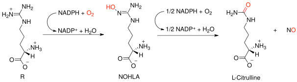 Nitric oxide synthases produce NO by catalysing a five-electron oxidation of a guanidino nitrogen of L-arginine (L-Arg). Oxidation of L-Arg to L-citrulline occurs via two successive monooxygenation reactions producing Nω-hydroxy-L-arginine (NOHLA) as an intermediate. 2 mol of O2 and 1.5 mol of NADPH are consumed per mole of NO formed.[3]