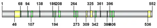 The FAM234A gene encodes a serine and leucine rich protein titled the "FAM234A Protein" or ITFG3. The encoded protein is 552 amino acids in length with a predicted molecular weight of 59,660Da and a basal isoelectric point of 5.84.[13] The FAM234A protein has a notable hydrophobic region from position 49-70 in the amino acid sequence that correlates with one of the two trans-membrane regions found on FAM234A.[14] FAM234A has membrane topology type 3a, indicating multiple trans-membrane regions with its N-terminus facing the cytosol. The protein is predicted to be located in the endoplasmic reticulum, with portions of it found within the endoplasmic reticulum lumen.[14] Within the cell, FAM234A has also been localized to the ribosomes and nucleus.[15]