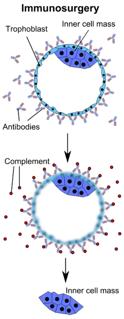 Immunosurgery is a method of selectively removing the external cell layer (trophoblast) of a blastocyst through a cytotoxicity procedure. The protocol for immunosurgery includes preincubation with an antiserum, rinsing it with embryonic stem cell derivation media to remove the antibodies, exposing it to complement, and then removing the lysed trophoectoderm through a pipette.[1] This technique is used to isolate the inner cell mass of the blastocyst. The trophoectoderm's cell junctions and tight epithelium "shield" the ICM from antibody binding by effectively making the cell impermeable to macromolecules.[2][3]