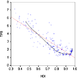 In an article published in Nature, Myrskylä et al. pointed out that "unprecedented increases" in social and economic development in the 20th century had been accompanied by considerable declines in population growth rates and fertility. This negative association between human fertility and socio-economic development has been "one of the most solidly established and generally accepted empirical regularities in the social sciences".[40] The researchers used cross-sectional and longitudinal analyses to examine the relationship between total fertility rate (TFR) and the human development index (HDI).