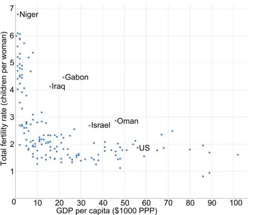 Income and fertility is the association between monetary gain on one hand, and the tendency to produce offspring on the other. There is generally an inverse correlation between income and the total fertility rate within and between nations.[3][4] The higher the degree of education and GDP per capita of a human population, subpopulation or social stratum, the fewer children are born in any developed country.[5] In a 1974 United Nations population conference in Bucharest, Karan Singh, a former minister of population in India, illustrated this trend by stating "Development is the best contraceptive."[6] In 2015, this thesis was supported by Vogl, T.S., who concluded that increasing the cumulative educational attainment of a generation of parents was by far the most important predictor of the inverse correlation between income and fertility based on a sample of 48 developing countries.[7]