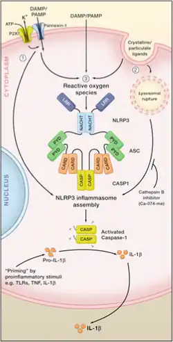 - ↑ Swanson, Karen V.; Deng, Meng; Ting, Jenny P.-Y. (August 2019). "The NLRP3 inflammasome: molecular activation and regulation to therapeutics". Nature Reviews Immunology. 19 (8): 477–489. doi:10.1038/s41577-019-0165-0. ISSN 1474-1733. PMC 7807242. PMID 31036962.